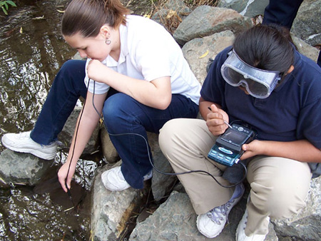Introduction: Students in the fourth grade bilingual class at Almaden Elementary School collaborated with the students at River Glen and Zanker School as part of their BioSITE project. The information that they gathered and the activities that they participated in were shared with the students in the other two schools. In turn, the students at Almaden read the newsletters created by the seventh graders at River Glen and heard about what was being done at Zanker School. Guadalupe Creek Research: BioSITE Almaden students participate in a year-long study of a local creek, the Guadalupe Creek, and learn about the watershed it is part of. They meet by the creek once a month to work with high-school age mentors to conduct water quality testing. These include temperature, dissolved oxygen, pH, turbidity, conductivity, and rate of flow. They learn about each of the test norms for most creek dwellers and predict how fluctuations can impact organisms, and what might cause fluctuations, especially pollution and weather. Students see examples of debris pollution, the effects of erosion and storm damage. The water quality data is documented and discussed. These and other activities are documented online on the link at the top of the page: 'Guadalupe Creek Research.' These pages were shared with students from River Glen and Zanker Schools. While the high school students provided equipment for water quality testing, some of our students had the opportunity to use temperature probes with a Palm Pilot as well. A step-by-step webpage guide was put together on how to use this technology and upload data to a laptop computer for further analysis or graphing. Students were amazed to see the minute increments of a single degree of Celsius that the probe was able to sense and record in short timed intervals. They were also surprised to see that the water temperature was not steady, but continuously fluctuating within hundreths of a degree increments. At the top of this page, click 'Using the Palm' to view the guide.
