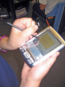 The students then learned how to create storyboards to plan out their public service announcements. Inspiration software was used for the creation of the storyboards. Each collaborative group created a six-shot storyboard that included dialogue between the actors/actresses, the most critical facts about their topic from their research, and the persuasive message urging viewers to take action. The teacher uploaded all of the storyboards to a PDA that could be displayed using the Palm OS version of Inspiration. To view a sample storyboard, click here. Toward the end of January, the students filmed the PSAs. The directors of each group used the PDA to display their group's storyboard in order to direct the actors/actresses and the camera operators.